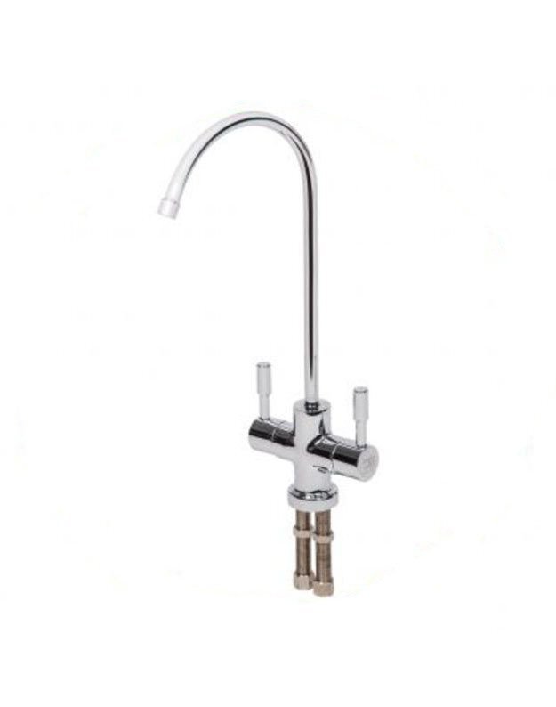 Aukštos kokybės, modernus dvigubas kranelis, geriamojo vandens sistemoms RO. Montuojamas ant plautuvės ar virtuvės stalviršio. Tinkantis RO6, RO7, RO8, S800, Aquafilter ir kt. sistemoms. Su nulenkiamomis svirtelėmis.